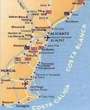 The Costa Cálida, just below the Costa Blanca, adjoins two different seas, the Mar Menor and the Mediterranean, and has warm weather all year round. The Mar Menor is a sea water lagoon formed by the La Manga strip and the Costa Calida coast. The water temperature reaches 30°C in the summer - warmer than the Mediterranean and the area is famous for its therapeutic mud, popular with the Spanish for soothing various joint ailments and skin conditions. The nearby nature reserve at the salt lakes is home to flamingos, herons, eagles, owls, storks, terns, plovers and avocets. The region of Murcia is varied and offers visitors historic towns, including Murcia City and Cartagena, splendid mountains, national parks and some beautiful coastline. Alicante is a popular holiday destination and the city itself has an impressive castle and other interesting architecture.